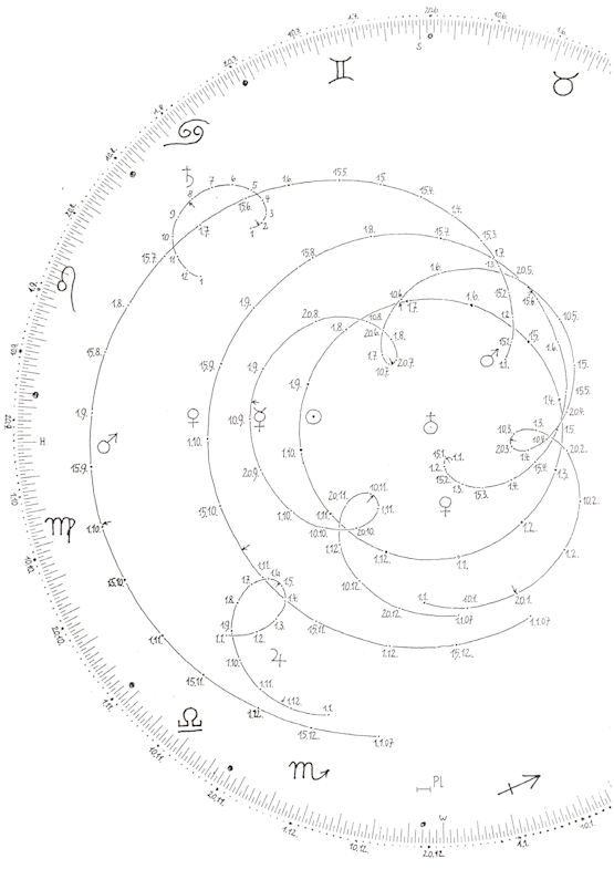 sein. Vorsicht! Nur mit speziellen Sonnenfiltern ausgestattete Ferngläser benützen, sonst wird das Auge unheilbar geschädigt. Da jede Schleife ein wenig früher gebildet wird, als ein Drittel des Tierkreises ausmachen würde, so liegt der Ort der Vierten Schleife vor demjenigen der ersten. Dadurch wandern die Merkurschleifen langsam in gegen- läufiger Bewegung durch den Tierkreis. Die Venus tritt ebenfalls bei ihrer Schleifenbildung zwischen Sonne und Erde. In acht Jahren führt sie fünf Schleifen aus, deren Lage einen regelmäßigen Fünfstern bilden. Nur zwei Tage fehlen um die acht Jahre rund zu machen, sodass die Venus sich über lange Zeit vor dem gleichen Tierkreishintergrund aufhält. Den Durchgang dieser Planeten vor der Sonne bezeichnet man als untere Konjunktion und diese Planeten sind die untersonnigen Planeten. Dazu zählt auch der Mond; nur ist seine Rolle als Erdtrabant noch eine andere. Von den obersonnigen Planeten ist es der Mars, der bei seiner größten Annäherung der Erde näher sein kann als die Venus, allerdings dann auf der Nachtseite der Erde in Opposition zu Sonne. Jupiter und Saturn sind ebenfalls bei ihrer Schleifenbildung in Opposition zur Sonne, also in ihrer besten Sichtbarkeitsphase. In der Karte ist der Abstand der Erde zur Sonne (eine astronomische Einheit) um das Vierfache vergrößert, ebenso für Merkur, Venus und Mars. Für Jupiter um das Eineinhalbfache, während Saturn im Maßstab eins zu eins wiedergegeben ist. Für Uranus wurde die Entfernungswerte halbiert und bei Neptun und Pluto gedrittelt.
