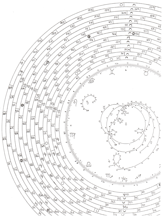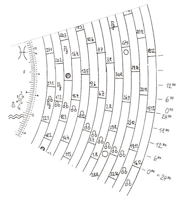 dass in der Hälfte des Tagesraumes der Mittagspunkt erreicht ist (12:00 Uhr). Innerhalb der Mondbahn sind alle im Beobachtungszeitraum stattfindenden Voll- und Neumonde, auf- und absteigende Mondknoten sowie die größte und geringste Annäherung des Mondes an die Erde eingezeichnet. Für alle Maßnahmen im Lebendigen haben sich die Finsterniszeiten und die Erdnähe (Perigäum) des Mondes als Benachteiligend erwiesen. Um den Mond in seinem Gang vor den Tierkreishintergrund leichter zu beobachten kann man von der Erde in der Kartenmitte eine feine Bleistiftlinie über die Grenzpunkte zwischen den Tierkreisbildern bis zum Kartenrand ziehen und erhält dadurch den exakten Übergang des Mondes in das folgende Sternbild des Tierkreises. Durch zartes Einfärben der einzelnen Tierkreissegmente entsteht eine weitere Grundlage für die Wahrnehmungsschulung. Als Farben können die von G.Wachsmut für die Bildekräfte verwendeten genommen werden; das sind: